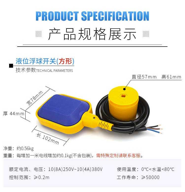 浮球开关适应于控制泵运转来维持液位;控制罐的自动装卸;控制液位或供给信号,如油箱、自动清洗系统、液压罐、低压锅炉、污水处理系统。